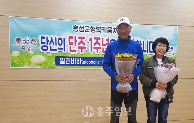 홍성군 희망복지지원단은 지난달 25일 광천읍 문예회관에서 알코올 중독자였던 2명의 주민이 단주 1주년을 맞아 축하하는 행사가 열렸다.<사진>