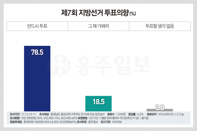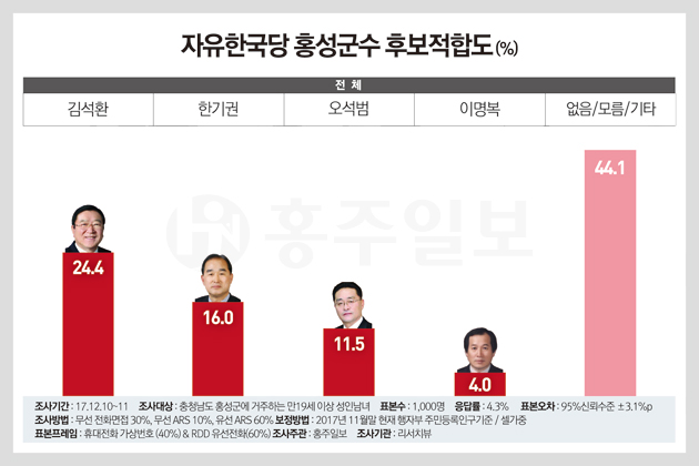이번 여론조사는 홍주일보·홍주신문이 여론조사전문기관인 ‘리서치뷰’(대표 안일원·서울 영등포구 여의도 소재)에 의뢰해 진행한 것으로 12월 10일부터 11일까지 이틀간 실시됐으며, 홍성군에 거주하는 만 19세 이상 성인남녀 1000명을 대상으로 휴대전화 가상번호 40%, RDD유선전화 60%를 대상으로 무선 전화면접(30%), 무선 ARS자동응답시스템(10%)와 무선 ARS자동응답시스템(60%)의 혼합조사방식으로 진행했다. 통계보정방법은 2017년 11월말 현재 행정자치부 주민등록 인구비례/셀가중에 따라 성과 연령, 지역별 가중치를 부여했고, 표본오차는 95%신뢰수준에 ±3.1%P, 응답율은 4.3%다.