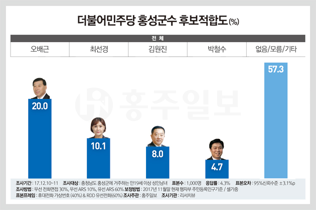 또한 전체 홍성군민을 대상으로 한 ▲더불어민주당 홍성군수 후보 적합도를 묻는 질문에 △오배근 현 충남도의원 20.0% △최선경 현 홍성군의원 10.1% △김원진 전 홍성군의원 8.0% △박철수 한림성심대 교수가 4.7% 순으로 나타났으며, △무응답층은 57.3%로 조사됐다.
