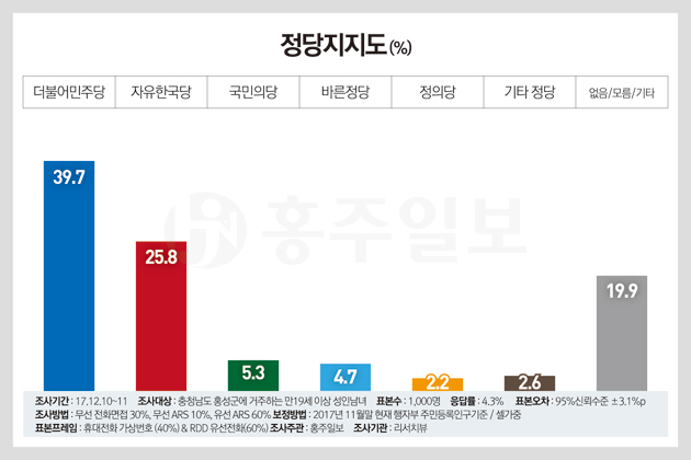 홍성군민을 대상으로 현재 지지하거나 더 호감이 가는 ▲정당지지도를 묻는 질문에는 △더불어민주당 39.7% △자유한국당 25.8% △국민의당 5.3% △바른정당 4.7% △정의당 2.2% 순으로 나타났으며, △기타정당 2.6% △무당층 또는 무응답이 19.9%로 조사됐다. 한편 지역현안을 묻는 질문에는 ▲홍성군과 예산군의 통합에 대한 찬반을 물은 결과 △찬성이 58.5% △반대가 20.6%로 나타나, 통합 찬성 응답이 2.8배 가량인 37.9%p 높은 것으로 조사됐으며, △무응답은 20.9%로 조사됐다.