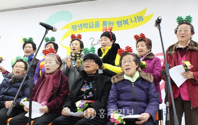 평생학습을 통한 행복나눔 ‘2017 홍성군 평생학습 전시회’가 지난 8일 홍성도서관에서 100여 명이 참석한 가운데 열렸다. 이 날 행사는 하모니카, 우쿨렐라 등 학습동아리 공연단의 축하 공연 및 성인문해학습 과정을 마친 33명의 만학 어르신들에게 수료장이 전달됐다.