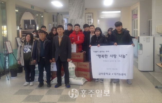 금마중학교(교장 주진익) 학생들이 지난 8일 한 해 동안 직접 농사를 지어 거둔 쌀과 함께 김장김치를 사회복지법인 청로회(대표 이철이)에 전달했다. 이번에 후원받은 물품은 청로회를 이용하는 청소년과 어르신들을 위해 사용된다. 저작권자 © 홍주일보 무단전재 및 재배포 금지 홍주일보 다른기사 보기 페이스북 카카오톡 URL복사 기사공유하기