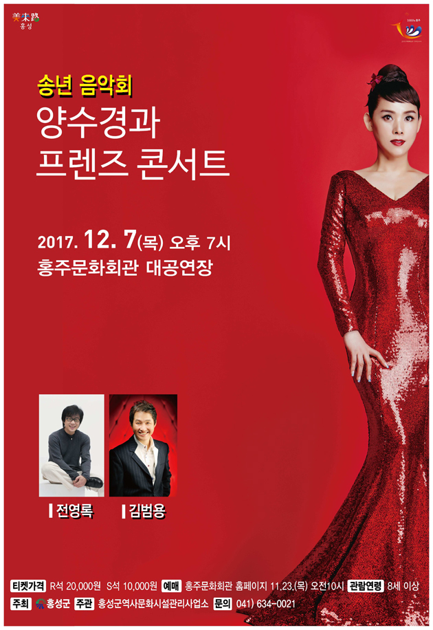 지난 9월 이화여대 단독콘서트 ‘초대’를 매진시키며 성황리에 공연을 마친 양수경 씨는 “학창시절의 우상이자 가수의 꿈을 꾸게 해준 전영록 선배, 늘 뒤에서 든든한 지원을 아끼지 않았던 김범용 선배와 같은 무대에서 노래를 부를 수 있어 영광이다”라고 소감을 전하며 홍성을 시작으로 2018년에는 전국투어를 통해 관객들을 만날 계획이라고 밝혔다. R석 2만원, S석 1만원으로 홍주문화회관 홈페이지에서 예매가 가능하다. 문의는 634-0021로 하면 된다.