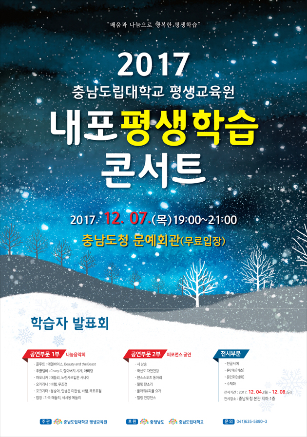 또한 내포 평생학습 콘서트는 다음달 7일 도청 문예회관에서 열리는데 우쿨렐레, 오카리나, 합창, 시 낭송, 요가, 스포츠댄스 등 다채로운 공연이 열릴 예정이다.