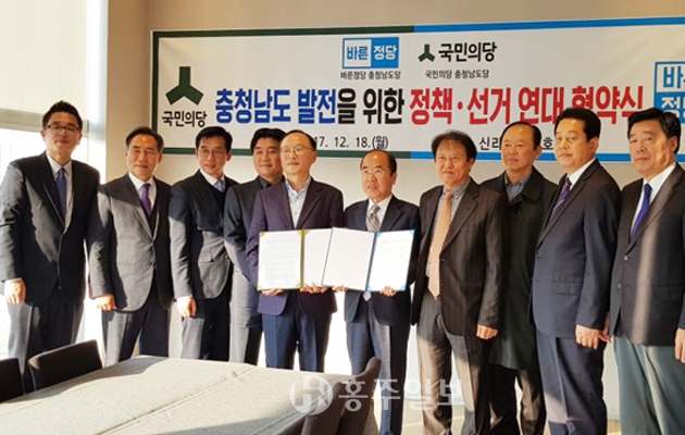 국민의당 충남도당(위원장 조규선)과 바른정당 충남도당(위원장 김제식)은 지난 18일 신라스테이호텔에서 내년 6·13지방선거를 앞두고 충남발전을 위한 정책 발굴과 지방선거 후보연대를 추진할 정책연대와 선거연대 협의체를 구성, 공동합의문 협약식을 통해 양당체제의 정치적 현실을 개혁하겠다는 의지를 밝혔다. 이에 따라 양당은 ‘충남 선거·정책연대 실무협의체’를 상시 운영하고 앞으로 도지사·시장·군수·도·시의원 후보 등 전 부문에 걸쳐서 선거연대와 정책연대를 해 나가기로 했다.