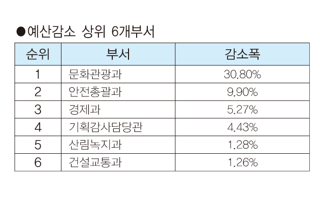 그 밖에 경제과 4억3307만3000원(5.27%)이 감축된 77억8608만5000원, 기획감사담당관 5억9985만4000원(4.43%)이 감축된 129억2988만2000원, 산림녹지과 1억7908만6000원(1.28%)이 감축된 138억25만3000원, 건설교통과 4억1256만5000원(1.26%)이 감축된 322억3105만 원으로 확정됐다.
