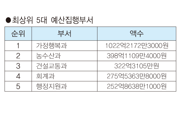 가정행복과는 단일부서 가운데 유일하게 1000억 원을 초과했다. 내년도 일반회계 4800억 원의 전체 예산 가운데 가정행복과가 차지하는 비중도 21%다. 그 뒤를 잇는 농수산과의 398억1109만4000원보다도 약 600억 원이 더 많았다. 가정행복과는 각종 복지시설과 다양한 취약계층, 그 밖에도 일반 군민들을 대상으로 한 복지분야의 파이를 잔뜩 키운 것이다.