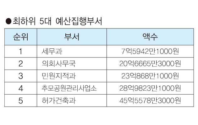 내년도 예산이 가장 적은 부서는 7억5942만1000원의 세무과였다. 이번에 76.13%나 증액했는데도 배당된 예산액 규모로는 만년 꼴찌다. 사실 군청이 전체 살림을 살 수 있도록 세금을 거둬 수익을 올리는 부서가 세무과다. 실컷 벌어서 다 나눠주고 정작 자신의 곳간은 가장 빈약해 재주는 곰이 부리고 돈은 다른 부서에서 가져가 생색을 내는 셈이 됐다. 그 다음으로 최저 예산 집행부서는 20억6665만3000원이 배정된 의회 사무국, 23억868만1000원의 민원지적과, 28억9823만1000원의 추모공원관리사업소, 45억5578만3000원의 허가건축과 순이었다.