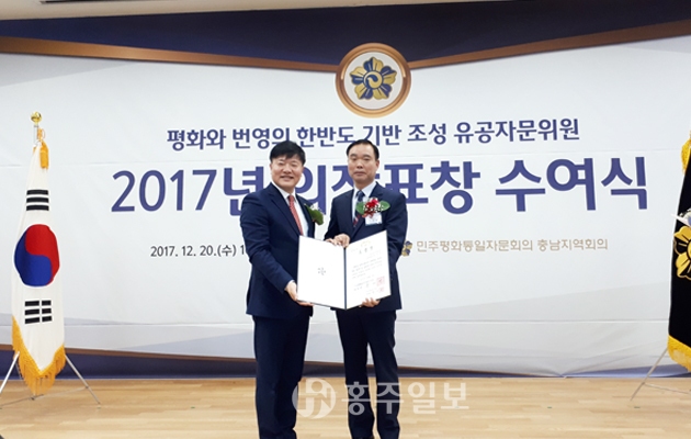 민주평화통일자문회의 홍성군협의회 이준성(56) 자문위원이 지난 20일 충남도청에서 열린 민주평화통일자문회의 충남지역회의 2017 통일간담회 및 의장 표창 수여식에서 의장표창을 받았다.<사진>