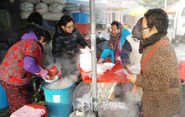 시어머니인 강월옥 씨는 장에 오는 사람을 위해 동지 전날 팥죽을 끓여 무료로 나누어주기 시작했는데 이를 이어 김연숙 씨가, 그 딸인 송 은 씨가 어머니를 도와 온 가족이 나서 팥죽을 끓인 기간이 올해로 벌써 26년째다.