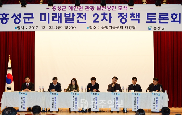 홍성군은 지난 22일 천수만 해안권 관광 발전방안을 모색하기 위해 전문가, 군의원, 지역발전협의회, 지역주민, 공무원 등 200여 명이 참여한 가운데 미래발전 2차 정책토론회를 개최했다.<사진>