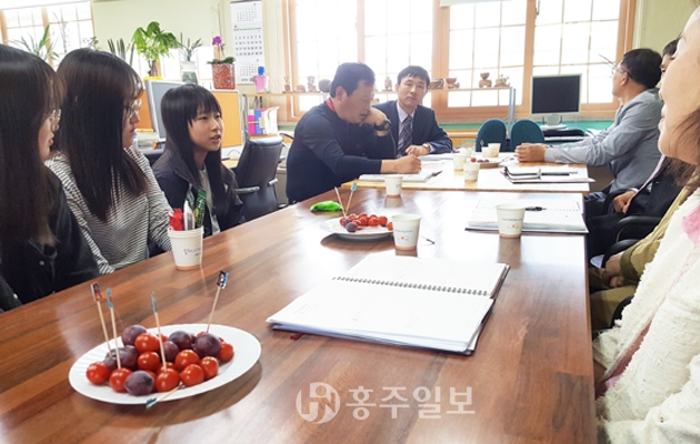 교직원학습공동체의 일환 중 하나인 교사협의회에서 학생과 교사들이 회의를 하는 모습 .