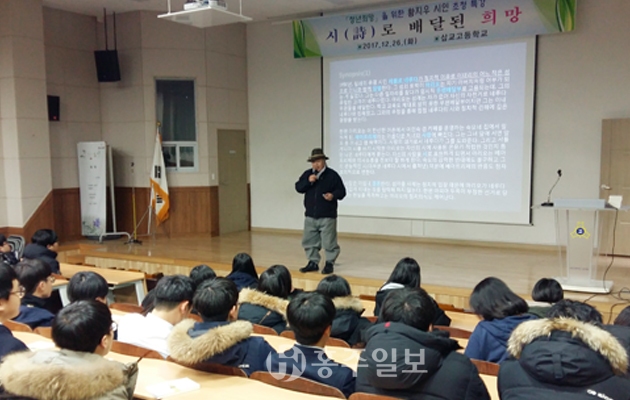 ‘너를 기다리는 동안’, ‘새들도 세상을 뜨는구나’, ‘겨울나무로부터 봄 나무에로’ 등으로 널리 알려진 황지우 시인의 특강이 ‘시(詩)로 배달된 희망’을 주제로 지난 26일 삽교고등학교에서 열렸다.