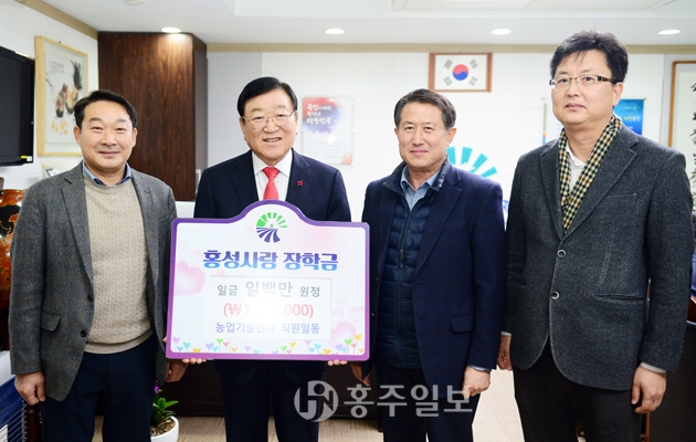 홍성군농업기술센터(소장 윤길선)가 지난달 29일 아름다운 기부문화 확산과 지역사회 발전의 원동력인 지역 우수인재 육성을 위해 홍성사랑장학회에 100만 원을 기탁했다. <사진>