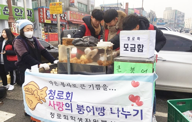 홍성군 청소년 연합 봉사동아리 청로회(회장 이철이) 회원들이 지난 23일 하상주차장 앞에서 사랑의 붕어빵 행사를 실시했다.