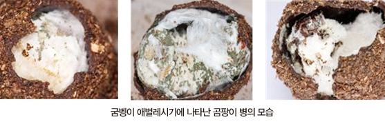 따라서 대량 사육 과정에서 곤충 질병 중 곰팡이 병에 감염된 애벌레가 발견되는 즉시 애벌레 전체를 소각하거나 땅에 묻어 다른 사육상자로 전염되는 사례를 사전에 차단하는 것이 중요하다. 아직 감염되지 않은 애벌레라고 골라서 다른 사육 상자 속에 넣는 순간 다른 사육 상자 속의 싱싱한 애벌레 까지 모두 감염되는 원인이 되기 때문이다.