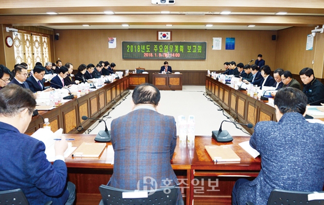 홍성군은 지난 8일 군청 회의실에서 김석환 군수와 이용록 부군수를 비롯한 각 담당관·과장, 직속기관·사업소장 및 군정자문단 등이 참석한 가운데 2018년 주요업무계획 보고회를 개최했다.