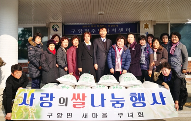 구항면 새마을부녀회가 지난 2000년부터 시작한 사랑의 쌀 전달식이 올해 18년째를 맞았다.올해 새마을부녀회 연시총회를 통해 기부된 쌀 500kg은 구항면사무소에서 면내 어려운 가구 25가구에 쌀 20kg씩 전달했다.