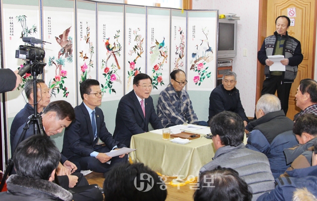 지난 23일 갑자기 기온이 영하로 내려가 맹추위가 기승을 부리던 날 오전 김석환 홍성군수가 구항면 지석마을을 찾았다. 새해 초부터 진행하고 있는 ‘마을단위 민생현장 방문’ 행사로 3주째 이어가고 있는데 대화보다는 군정홍보에 더 무게가 실린 듯 했다.