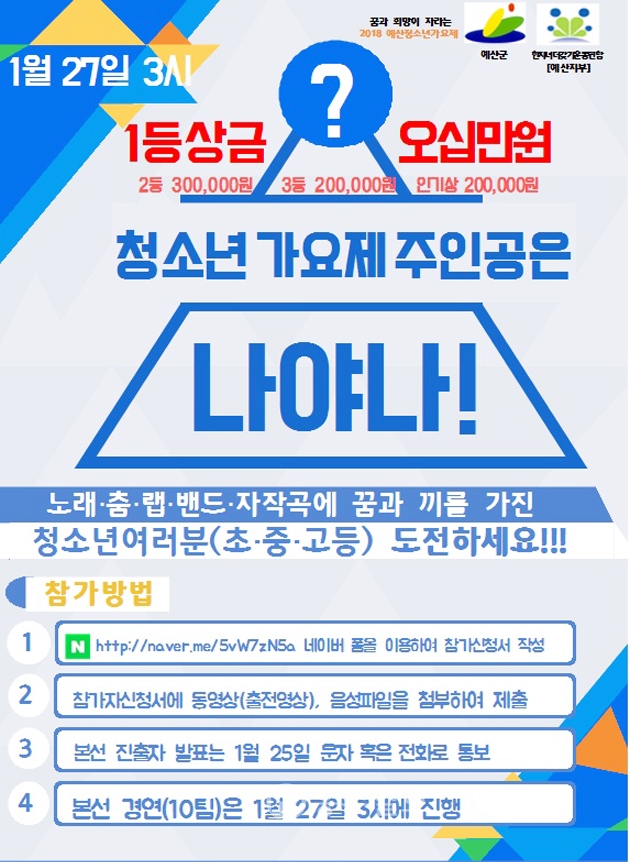 (사)한자녀더갖기운동연합 예산지부가 주관하고 예산군이 후원하는 ‘청소년 가요제 주인공은 나야나!’가 오는 27일 예산군청소년수련관에서 개최된다. (사)한자녀더갖기운동연합 예산지부는 연예인이 되고 싶어 하는 학생들에게 기회를 제공하며 가요제 중간 질의응답 시간을 가짐으로서 청소년들의 궁금증도 해결해주기 위해 이번 행사를 준비하게 되었다고 밝혔다.