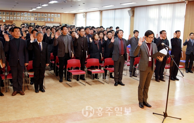 홍성군은 오는 6월 13일 실시되는 제7회 전국동시지방선거를 앞두고 공무원들의 엄정한 정치적 중립과 깨끗한 선거 추진을 위한 선거중립 결의대회를 개최했다. 지난 1일 군청 대강당에서 개최된 ‘공무원 선거중립결의대회’에서 이용록 부군수를 비롯한 300여 명의 공무원들은 130여 일 앞으로 다가온 제7회 전국동시지방선거의 정치적 중립에 대한 실천의지를 다짐하는 시간을 가졌다.