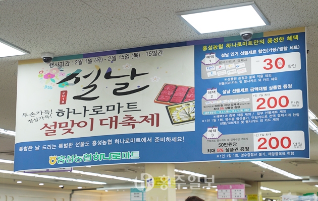 하나로마트 편은영 과장은 “워낙 경기가 안 좋기도 하고 홍성의 경우 김영란법 개정안에 그다지 영향을 받는 것 같지는 않다”며 “지난해는 주로 2~3만 원대 선물이 많이 나갔는데 이번에는 10만 원대 선물들이 좀 더 나갈 것으로 기대한다”고 말했다. 설 선물세트를 구매할 시 풍성한 혜택도 준비됐다. 행사카드로 결제할 시 30% 할인되며, 행사카드로 30만 원 이상 결제 시 최대 5% 상품권도 증정한다. 또한 바쁜 직장인들을 위해 홍성농협하나로마트 앱을 모바일에 설치해 주문하면 3만 원 이상 첫 구매 시 사골국물 2팩 사은품까지 받을 수 있다.