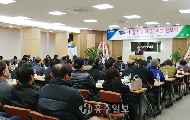 서부농협(조합장 표경덕)은 지난달 31일 조합 회의실에서 제46기 결산총회 및 비전선포식을 갖고 새 출발을 다짐했다. 지난해 서부농협은 △생명보험부문 업적평가 결과 사무소연도대상 수상 △NH농협생명 특별추진 대표이사 표창 △‘생명보험 행복한 마무리’ 캠페인 중앙회장상 수상 △손해보험 업적평가결과 그룹별 1위 달성 사무소연도대상 수상 △농작물재해보험(벼) 지역그룹별 평가 대표이사상 수상 등 무려 5개 부문에서 큰 상을 받는 등 괄목상대할 만한 성장을 이뤄 이 날 축제의 분위기 속에 총회가 진행됐다.