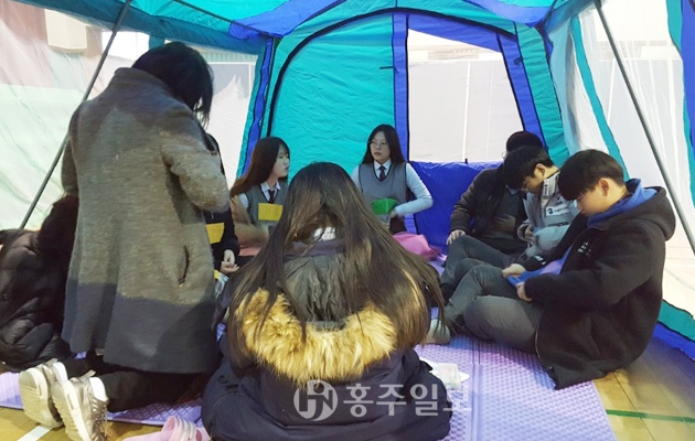 홍동중학교 학생들이 지난해 12월 18~20일에 학부모가 주관한 ‘나를 찾아서’라는 프로그램을 진행했다. <사진> 프로그램의 첫 활동은 신문지에 한 해 동안 나를 힘들게 했던 것들을 한 장에 하나씩 쓰고, 그 신문지들을 손이 아닌 발로 찢어버리는 활동이었다. 그리고 찢어버린 신문지 잔여물들을 구겨서 산타주머니에 던져 넣는다. 산타주머니에 넣는 이유는 ‘산타에게 선물을 받지 말고 우리가 선물을 주자’라는 의미가 담겨있다. 두 번째 활동은 질문을 듣고, 학부모들이 들고 있는 판넬을 보고 자신이 그 질문에 원하는 답을 들고 있는 학부모에게 가면 되는 활동이다.