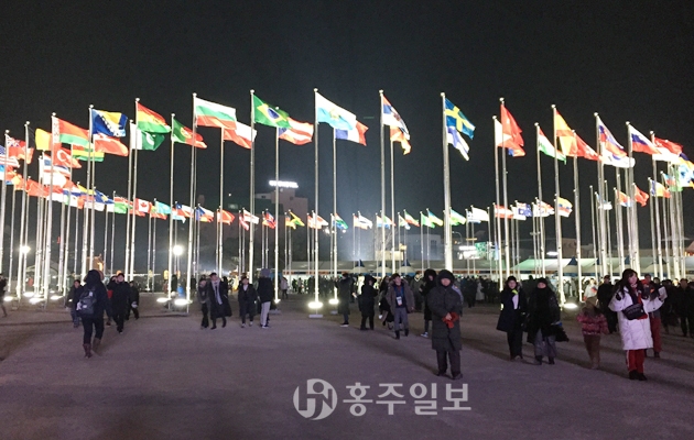 사진은 평창 올림픽 스타디움 광장에 펄럭이는 참가국 국기들.
