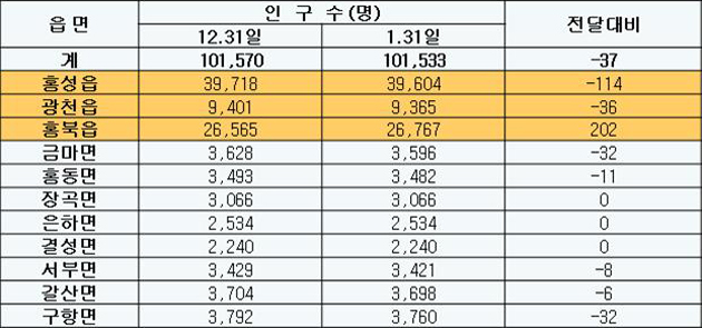 홍성군이 집계한 지난 1월말 읍·면별 인구현황을 살펴보면, 이미 4만 명선이 무너진 홍성읍이 한 달 사이 114명이 줄어들어 3만9604명으로 나타났다. 광천읍은 지난달 대비 36명이 줄어든 9365명, 이 같은 추세로 계속 내리막길을 걸을 경우 올해 연말 9천명선도 무너질 수 있다. 홍성군 3개 읍 중 내포신도시가 위치한 홍북읍만 한 달 사이 202명이 더 늘어난 2만6767명이었다.