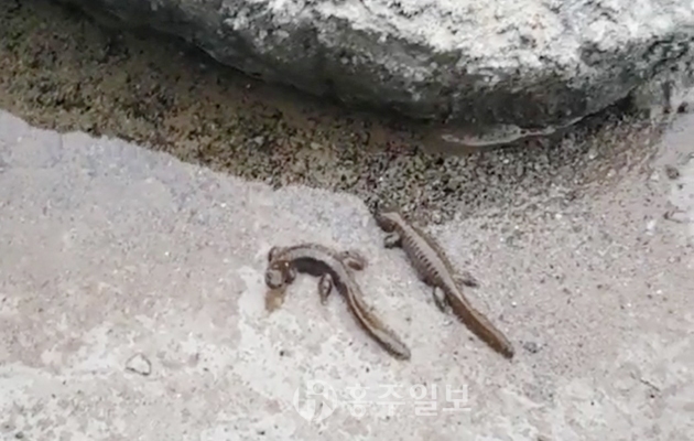 서부면 거차리 주민 김종덕 씨가 촬영한 도롱뇽 모습. 도롱뇽을 포함한 양서류는 세계자연보전연맹(IUCN)이 지정한 절멸가능성이 큰 야생동물이다. 사진은 서부면 거차리 57번지에서 촬영했으며 주위 논과 밭 사이 작은 개울에서 발견됐다. 저작권자 © 홍주일보 무단전재 및 재배포 금지 김옥선 기자 다른기사 보기 페이스북 카카오톡 URL복사 기사공유하기