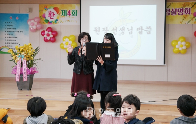 장진옥 원장은 “건강하고 바르게 자라는 원아와 사랑으로 가르치는 교사, 학부모가 삼위일체가 되어 행복을 주는 유치원을 함께 만들어 나가자”고 강조했다. 이 날 공직사회 청렴윤리 실천 분위기 확산·정착을 위해 이은주 원감과 학부모대표가 함께 반부패 청렴실천 다짐문 선언을 하기도 했다. 이어서 파워포인트를 통해 교육과정설명회를 진행해 학부모들에게 유치원 교육에 대한 이해를 도왔다.
