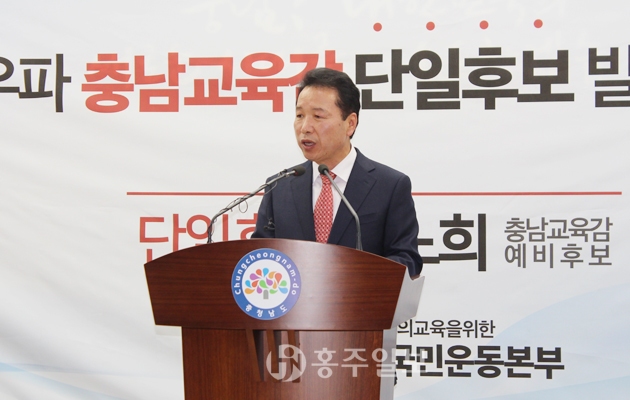 보수우파가 충남교육감 후보를 단일화했다. ‘전교조반대 및 미래창의교육을 위한 좋은 교육감 추대 국민운동본부’에서는 지난 12일 충남도청 프레스센터에서 기자회견을 가지고 범보수우파 충남교육감 단일후보로 명노희 예비후보를 공식 추대했다.