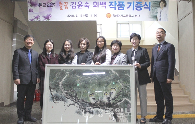 홍성여고(교장 심상룡)는 지난 15일 동문인 김윤숙 화가가 모교의 이전을 기념하기 위해 미술 작품을 기증했다고 밝혔다. 이 날 전정선 홍성여고 총동창회장을 비롯한 동창회 임원, 홍성여고 교직원 및 학생들이 참석한 가운데 홍성여고 본관에서 개최됐다. 이번에 기증한 작품은 2016년 당진문화재단이 주최한 ’당진 올해의 작가전 2016‘ 초대작가로 선정된 김윤숙 작가가 곧은 절개와 지조의 상징인 소나무와 지혜 및 부를 상징하는 부엉이를 소재로 그린 수묵담채화 ’백사대길‘(百事大吉 80호)외 1점(50호)이다.