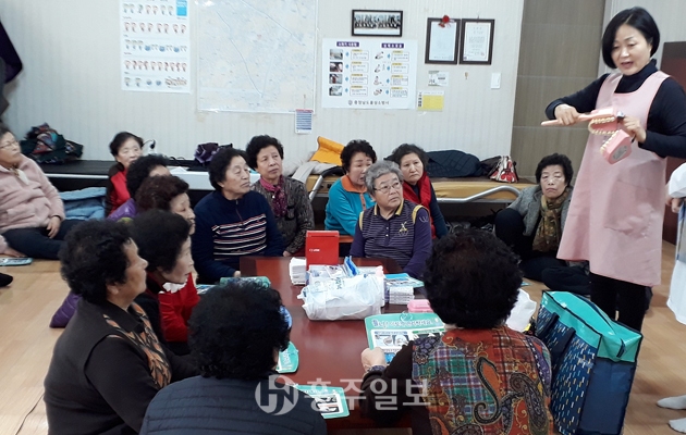 군은 지난 1월부터 ‘오복치아 장수교실’ 운영을 통해 군내 102개소 1800여 명의 어르신에게 바른 칫솔질법, 입마름증 예방을 위한 입체조, 틀니 관리방법, 구강위생용품 사용법 등 일대일 맞춤형 구강보건교육과 함께 구강관리용품을 제공해 주고 있다. <사진>