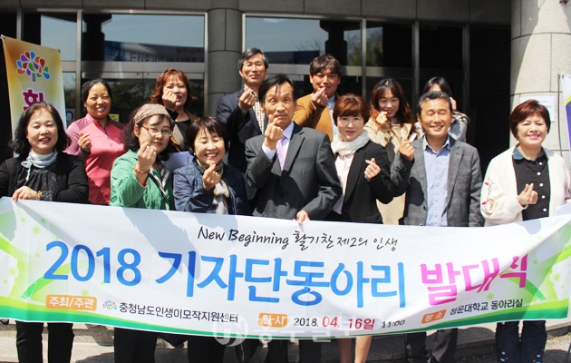 충청남도인생이모작지원센터(센터장 장현숙)는 지난 16일 청운대학교 인의관에서 2018년도 이모작기자단 제1기 발대식을 가졌다. 이모작기자단은 5·60대 중·장년층의 기자동아리로 기자단동아리를 통해 회원 간 친목과 화합을 도모해 건강하고 활기찬 인생을 지원하고, 지역사회 내 참여를 유도해 재능개발과 사회공헌 활동을 하는 목적이다.