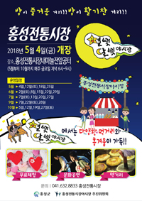 군과 홍성전통시장 주말장터 추진위원회가 함께 마련한 이번 별빛달빛 야시장은 매주 금요일 저녁 6시부터 9시까지 총 20회 개장할 예정이며, 장날에 해당하는 5월 11일, 6월 1일, 7월 6일, 9월 21일, 10월 26일은 다음날인 토요일에 운영된다.