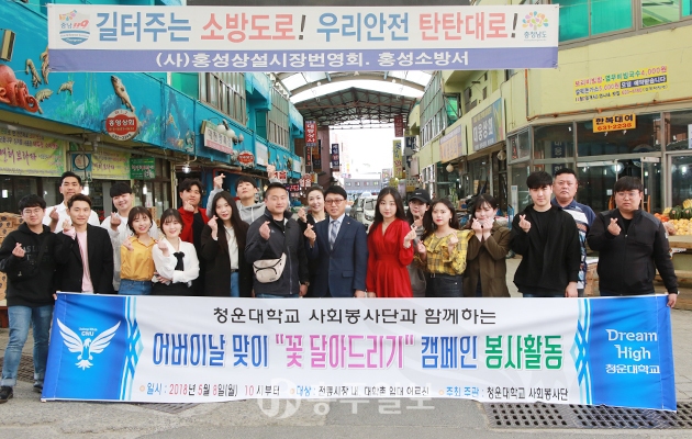 청운대학교(총장 이상렬)는 지난 8일 ‘제46회 어버이날’을 맞이해 홍성읍내에 위치한 전통시장 2곳 등을 방문, 지역 어르신들에게 카네이션 달아드리기 등 다양한 행사를 펼쳤다.<사진>