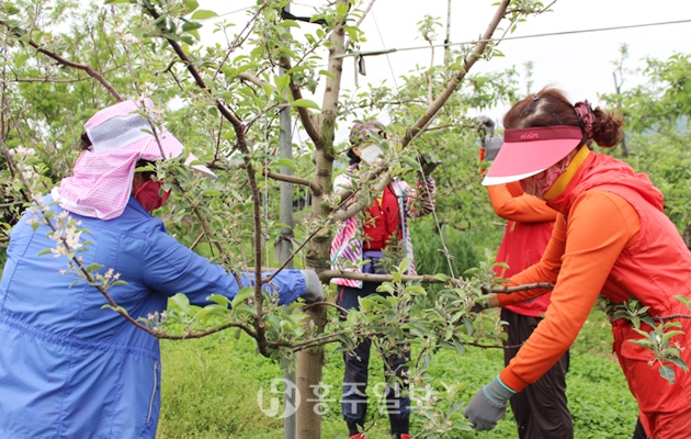 홍성농협주부대학 동창회(회장 이미자)가 지난 10일 본격적인 영농철을 맞아 농촌일손돕기 사과적과 작업을 진행했다.<사진>