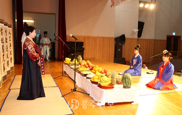 이날 전통 성년식에는 홍주향토문화연구회 안병주 회장의 주례와 권혜숙 씨를 계자빈으로 모시고 혜전대학교 성년자 대표 식품영양학과 강형주 군과 소방안전관리과 안현아 양이 성년이 되는 학생들을 대표해 관자와 계자를 맡았다.