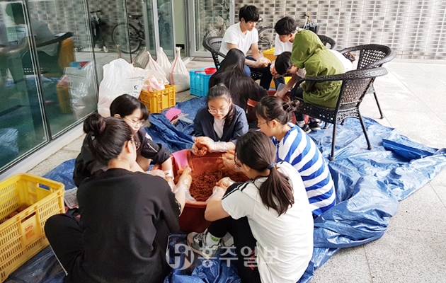 지난 11일과 12일은 내포중학교 학생 28명과 한국청소년복지문화원 충남지부 학생봉사자 10명이 내포출장소에 모여서 550개의 EM흙공, 사과박스 11개 분량을 만들었다.
