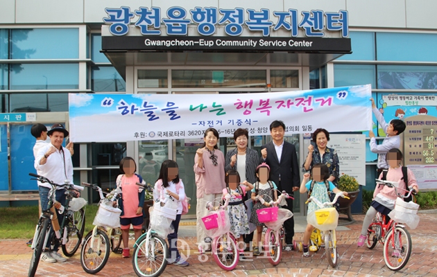 ‘아빠 없는 아이들의 아빠’ 데이빗 송 선교사가 자전거를 선물 받았다.<사진> 국제로타리클럽3620지구15-16년도 홍성청양지역협의회(회장 장순화)는 지난 29일 광천읍행정지원센터(읍장 김승환)를 방문, 사랑샘보육원 어린이 6명과 이들을 헌신적으로 돌보며 아빠 역할을 하고 있는 데이빗 송 선교사에게 자전거 7대를 기증했다.