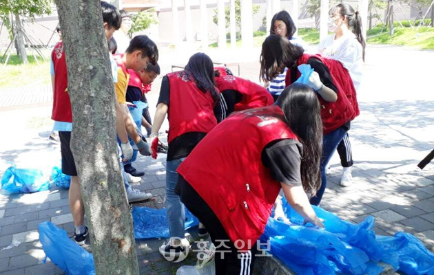 홍성군 청소년 자원봉사단 청로회(회장 이철이) 학생들이 지난 26일 우주은하아파트부터 롯데마트까지 환경정화 활동을 펼쳤다.이날 봉사활동은 갈산고등학교, 홍성고등학교, 홍성여자고등학교, 홍주고등학교 청로회 학생들이 참여해 곳곳에 흩어져 롯데마트까지 구슬땀을 흘리며 길에 떨어진 담배꽁초, 비닐, 종이, 캔 등을 주워 분리수거했다.<사진>