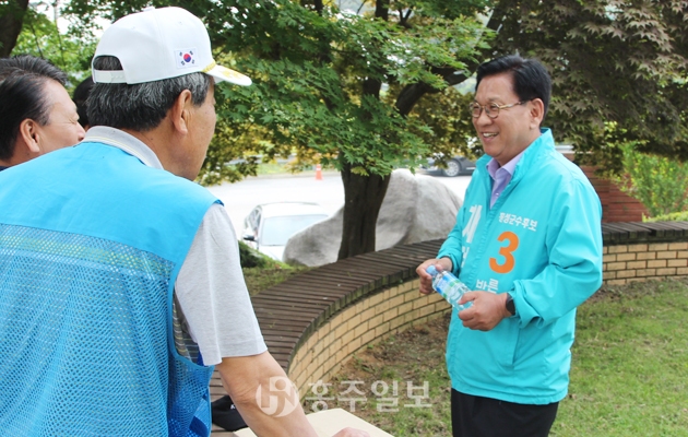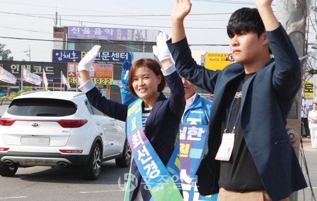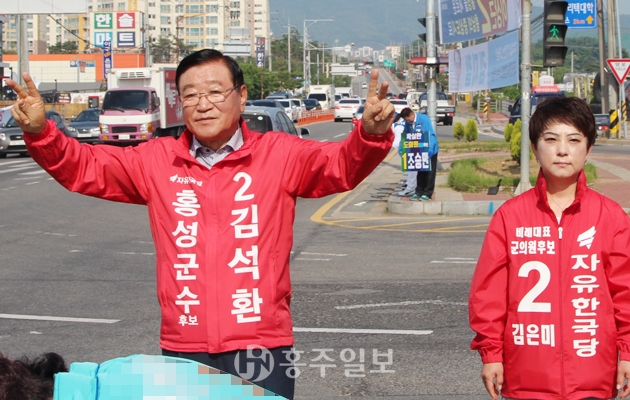 지난달 31일부터 본격적인 선거운동이 시작되면서 초여름을 맞아 달아오른 무더위만큼이나 열기가 뜨겁다. 지난 5일 아침 출근길에 홍성읍 덕산통 사거리에서 달리는 차량을 향해 아들과 함께 인사하는 더불어민주당 최선경 군수후보(맨 위쪽), 같은 날 같은 시간 덕산통 사거리 맞은편 신호등 앞에서 인사하는 자유한국당 김석환 군수후보(가운데). 지난 6일 오전 현충일 추념식이 시작되기 전 충령사에서 보훈단체 회원들과 인사를 나누는 바른미래당 채현병 군수후보.