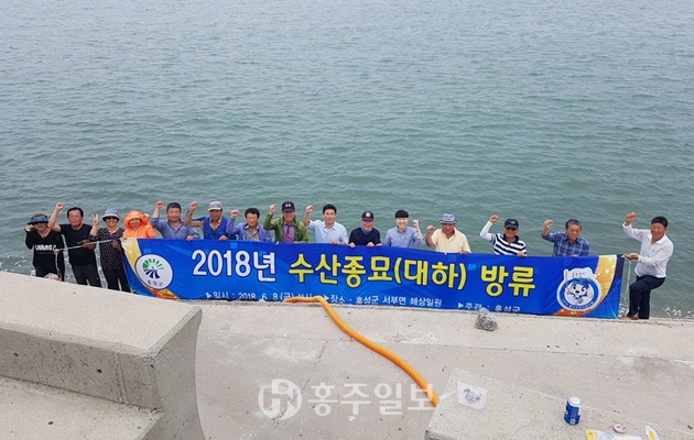 군이 지난 8일 수산자원 조성을 통한 지역 어업인의 소득증대 및 수산자원 증강을 위해 천수만에 전장 1.2cm 크기의 우량 대하 종묘 4500만 마리 방류를 실시했다.<사진>
