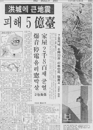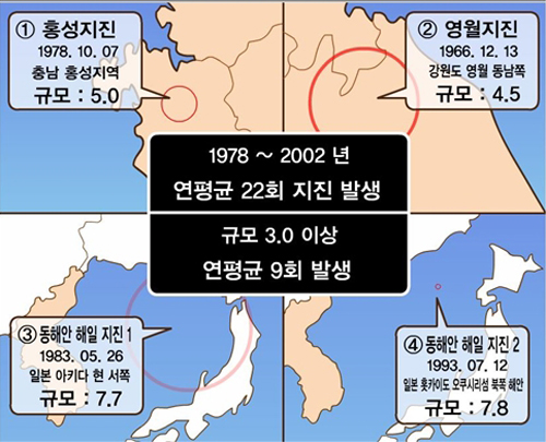 1978년 홍성지진 이후부터 기상청에서 우리나라에서 발생한 지진을 관측한 결과 지난 40년간 피해를 줄 수 있는 최소 규모의 지진인 리히터 규모 5.0이상의 지진은 지금까지 8회가 있었다. 그 중 큰 피해를 준 지진은 △지리산 쌍계산지진(1936) △홍성지진(1978) △영월지진(1996) △오대산지진(2007) 등이 있었다. 이중 영월지진의 경우는 규모가 4.5였음에도 제주도를 비롯한 많은 사람들이 지진파를 느낀 반면 홍성 지진은 5.0에도 광역적인 지진파를 느끼지 않았다. 최근인 2016년 9월 12일 오후 7시 44분. 경북 경주시 남남서쪽 8.2km 지점에서 규모 5.1의 △경주지진이 발생했고, 2017년 11월 15일 규모 5.4의 △포항지진이 발생했다.