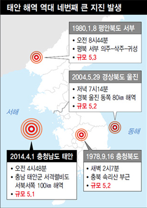 기상청이 지진 관측을 시작한 1978년부터 오늘까지 대전·충남·충북지역에서 발생한 지진은 대전 10회, 충남 144회, 충북 30회로 총 284회로 집계되고 있다. 이중 규모 3.0이상의 지진이 발생한 횟수는 대전 2회, 충남 37회, 충북 4회 등 43회로 대부분 충남지역에서 압도적으로 많이 발생한 것으로 나타나고 있다는 점에 주목할 일이다. 실제로 최근인 2014년 4월 1일 충남 태안군 서격렬비도 서북서쪽 100㎞ 해역에서 규모 5.1의 지진이 발생하기도 했다.