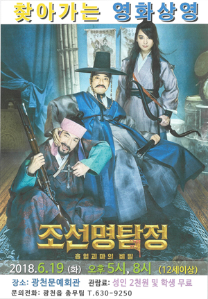 광천읍 광천문예회관에서는 오는 19일 ‘조선명탐정-흡혈괴마의 비밀’ 영화를 상영한다.<사진> 이번 영화 상영은 농번기 등 바쁜 일상에서 문화 향휴 기회가 부족한 주민들에게 유쾌하고 상쾌한 웃음을 선사할 계획이다. ‘조선명탐정-흡혈괴마의 비밀’은 유머와 흥미를 자극하는 추리 등 다양한 재미로 200만 관객을 동원한 영화로 오후 5시와 8시, 2회에 걸쳐 상영된다.