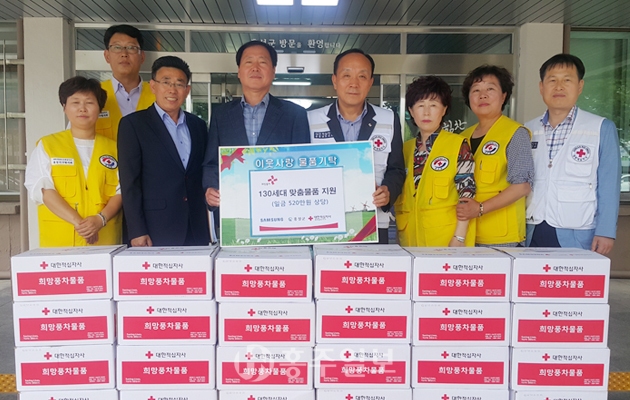 대한적십자사 충남지사는 삼성전자의 후원으로 지난 15일 군청을 방문해 어려운 이웃을 위한 희망전달물품 130세트를 전달했다. 이번 물품은 군내 아동청소년, 노인, 이주민, 위기가정 등 4대 취약계층 130가구에 전달될 에정이다.