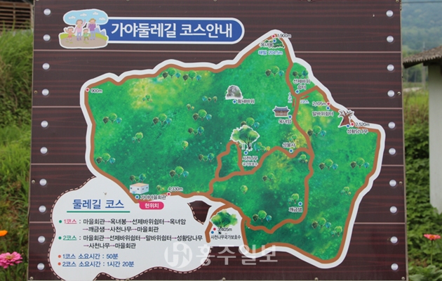 1코스는 50분이 소요되는 둘레길로 마을회관→옥녀봉→선제바위쉼터→옥녀암→깨끔샘→사천나무→마을회관이며, 2코스는 1시간 20분이 소요되는 둘레길로 마을회관→선제바위쉼터→말바위쉼터→성황당나무→사천나무→마을회관으로 돌아오도록 했다. 아직 찾아오는 사람은 드물지만 앞으로 마을 만들기 사업을 통해 농촌의 모습이 많이 바뀌게 되면 가야둘레길을 찾는 발길이 늘어날 것으로 기대하고 있다. 가야마을은 출향인들이 똘똘 뭉쳐서 고향을 적극 돕는 것으로도 유명하다. 출향인 모임은 연령대별로 나눠져 있는데, △청년회(40~50대) △개실아씨들(40~60대 여성들) △송천회(50~60대) △고향회(60~70대) 등 4개다.